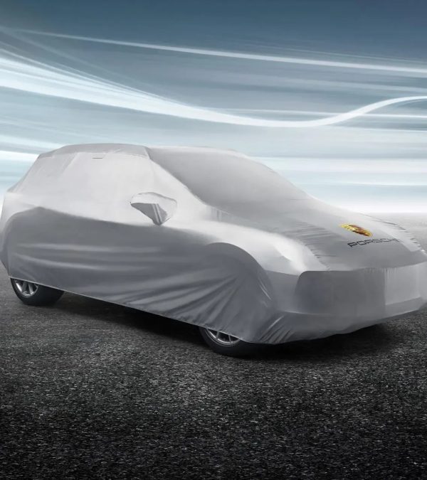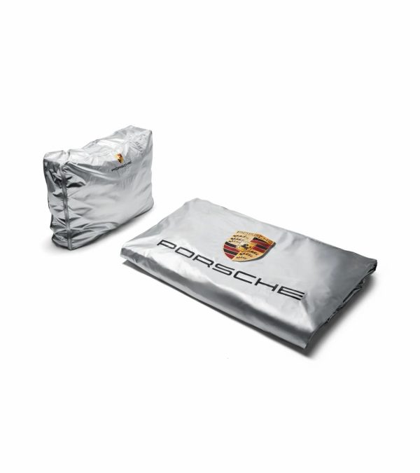 Protect your Cayenne Coupé (E3) from the elements with this perfect-fit Porsche outdoor car cover in white made from water-repellent material designed with a colored Porsche crest and PORSCHE logo.