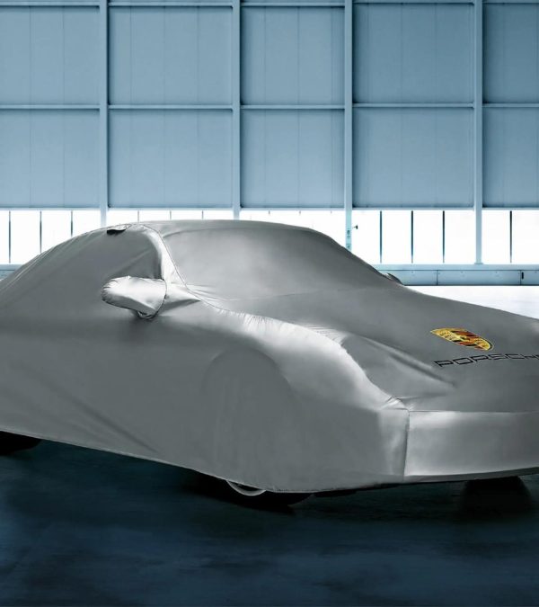 Protect your 911 (997 Turbo) from the elements with this perfect-fit Porsche outdoor car cover in white made from water-repellent material designed with a colored Porsche crest and PORSCHE logo.