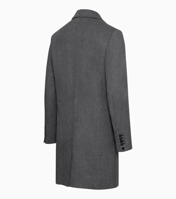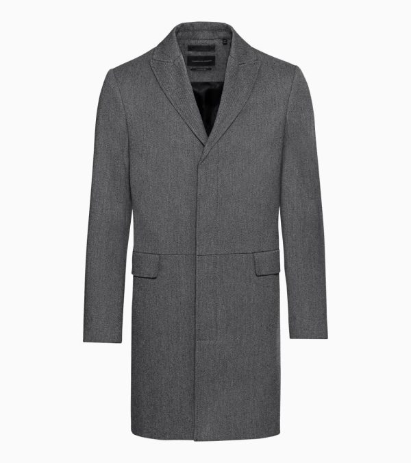 For business and leisure: Gray mottled designer coat with lapels for men. Exclusive minimalist design with concealed placket and horn buttons.
