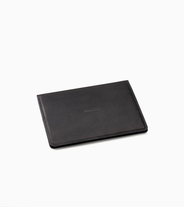 Designer leather tablet sleeve in a minimalistic style. Seamless, bonded design, suitable for tablets the size of an iPad 6. Develops an exclusive patina.