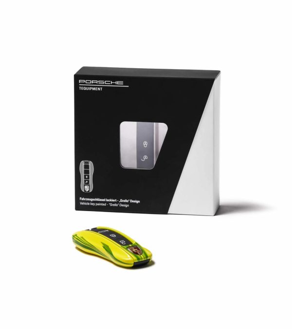 Channel the iconic design of a Nürburgring legend and a piece of motorsport history with the Porsche Painted Vehicle Key Sides in Design Edition Grello. These key sides mimic the legendary green and yellow 911 GT3 R ‘Grello’ racing car from Manthey Racing, which bears the start number #911. With its striking neon-colored paintwork, the ‘Grello’ is a real eye-catcher. Light up your Porsche with the distinctive arrows and unmistakable colors of the ‘Grello’ key sides—even when you’re not behind the wheel.