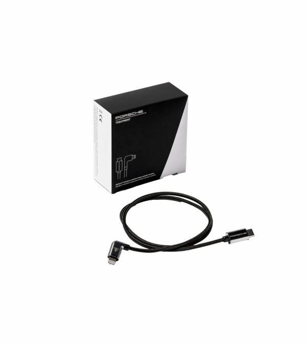 Black cable with angled Smartphone connection and straight USB type C™ connection. Approx. 25 inches (63 cm) length with silver connections and lasered “PORSCHE”logo. For charging the smartphone and for playing music (can be operated via steering wheel and PCM).
